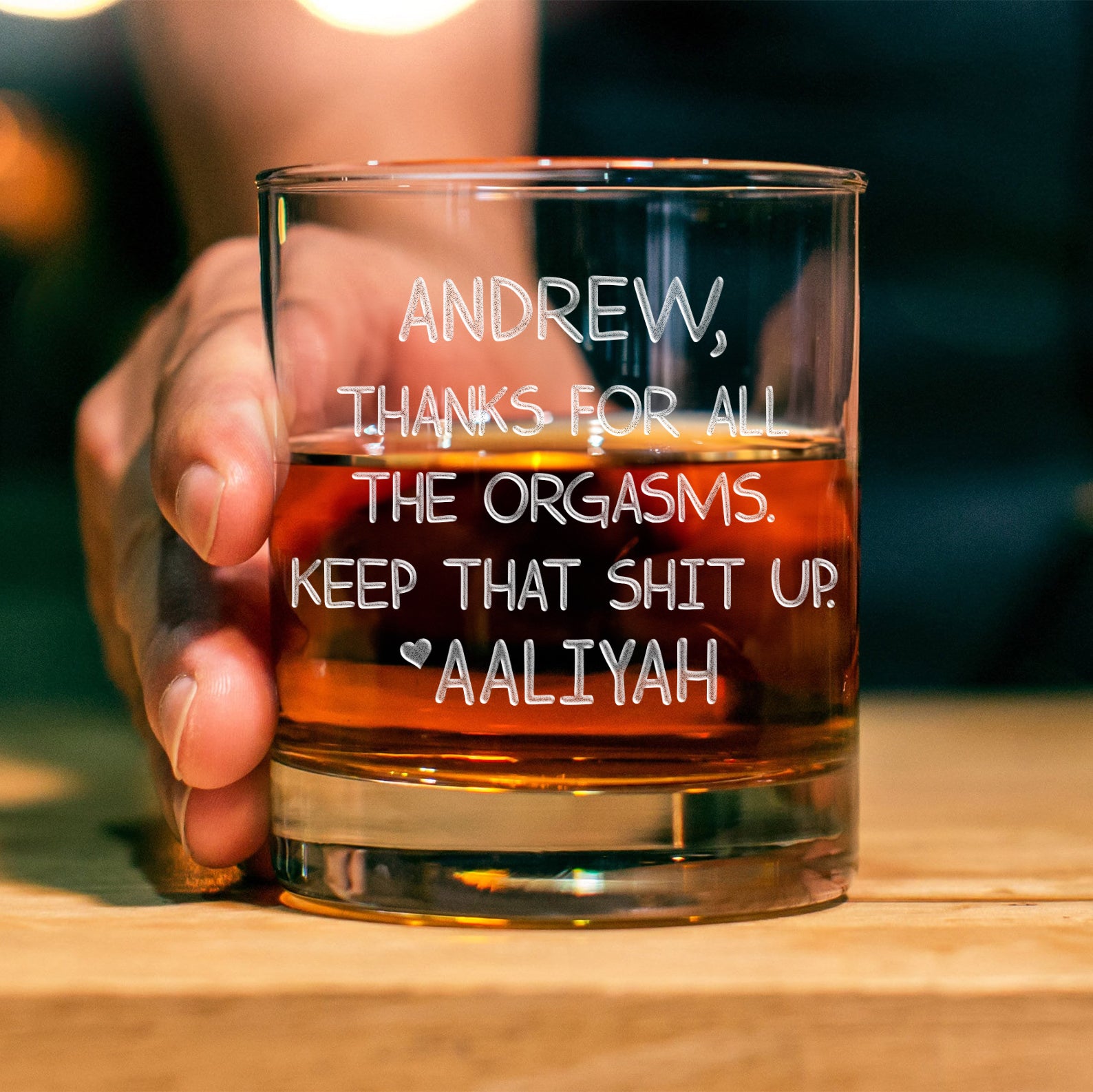 Spice up your man’s barware collection with a bold, cheeky twist. The "Thanks For All The Orgasms" Whiskey Glass isn't just hilarious—it’s delightfully flirty and sure to get a chuckle. With an 11 oz capacity and the option to add his name, it makes a perfect gift for husbands with a great sense of humor and a taste for bourbon.Whether you're planning a playful date night or looking for an anniversary gift that breaks tradition, this glass is the kind of unexpected surprise that says, "I love you... and your moves."