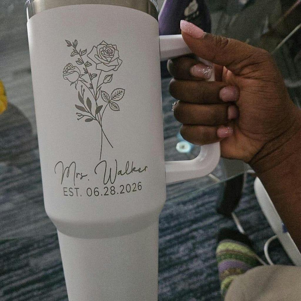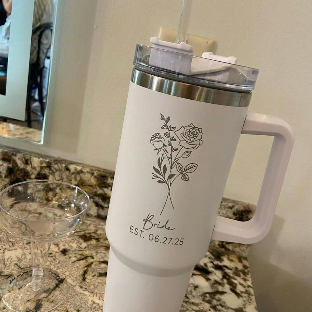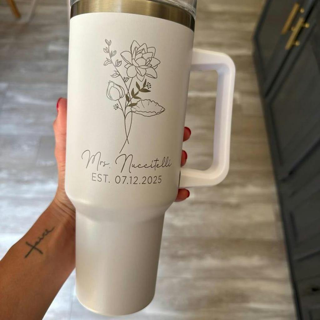 This custom 40oz tumbler is the perfect wedding gift for the future Mrs. Not only does it feature a personalized design, but it also keeps drinks cold for hours. Surprise the bride-to-be with this unique and practical gift for her engagement or bridal shower.