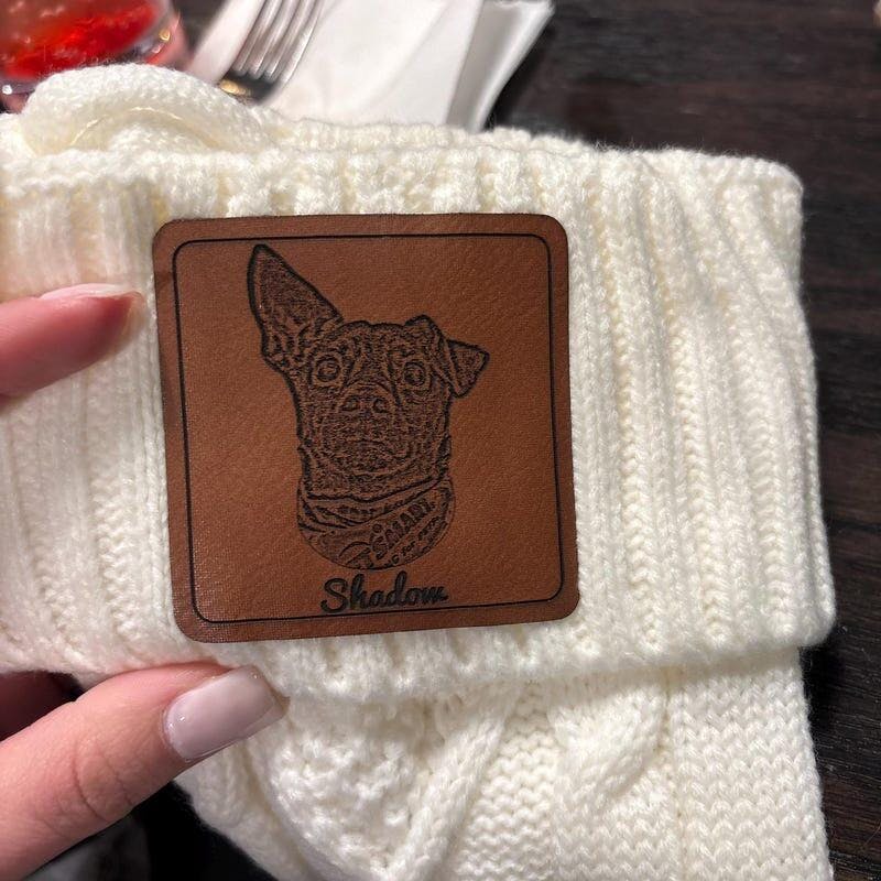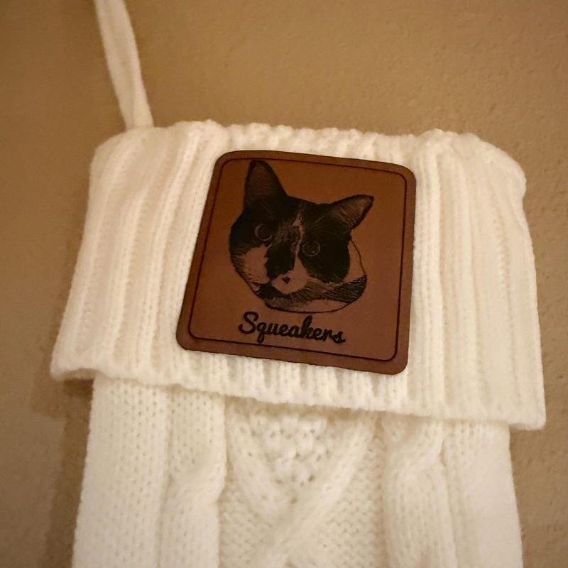 - Each stocking showcases a laser-engraved leatherette patch.