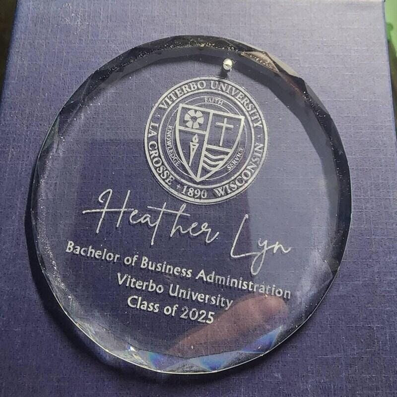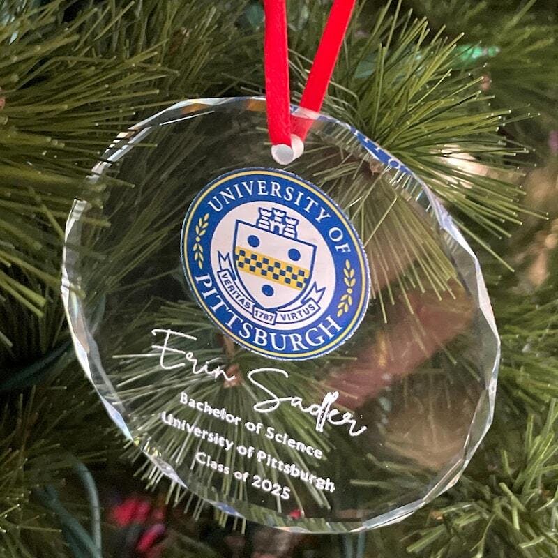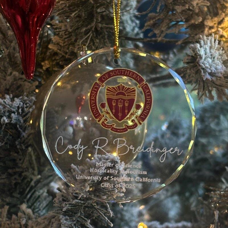 Celebrate the achievements of the Class of 2025 with this custom college logo graduation ornament. Expertly engraved to highlight their hard work and dedication, it makes a meaningful keepsake for graduates to cherish. Personalize it to honor their unique journey and proud college affiliation, offering a lasting reminder of this important milestone and the bright future ahead.