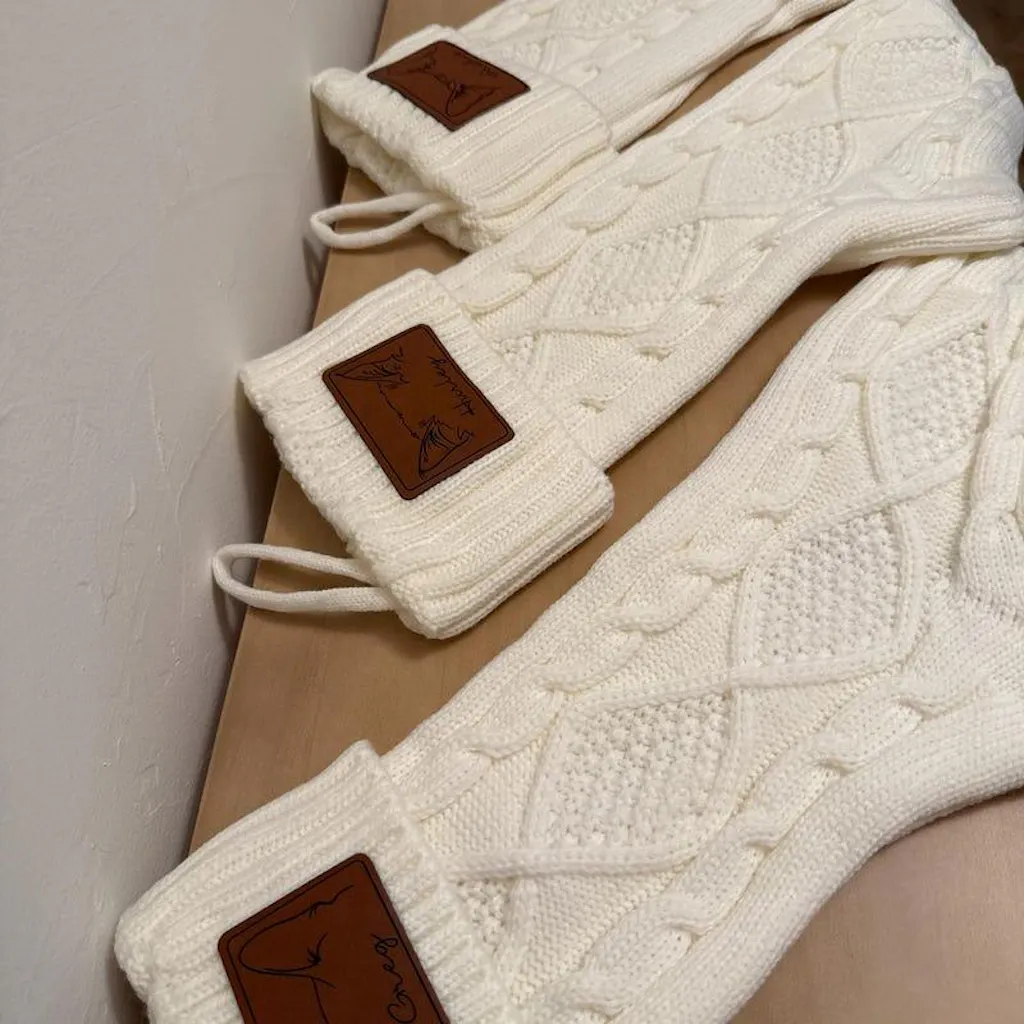 🌟 Made in a cozy ivory cable-knit sweater material, these stockings blend beauty with functionality. The stretchy fabric provides ample space for filling with all your favorite holiday treats!