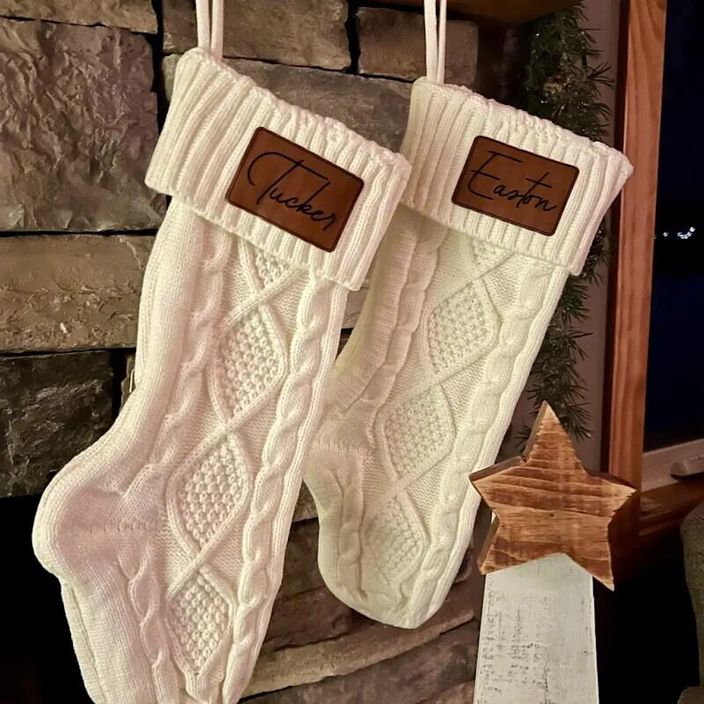 - Each stocking showcases a laser-engraved leatherette patch.