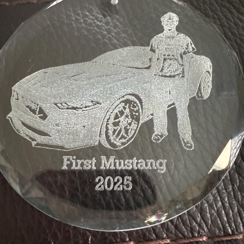 Beautiful quality ! I present our grandkids with a personal ornament each year and this one will be perfect for our oldest grandson. He bought his first car , so having an ornament etched with him and his Mustang is perfect. Customer service was exceptional as well. Thank you !