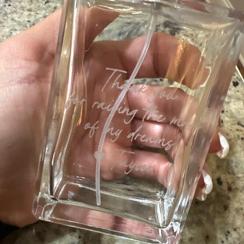 Treat Mom to a unique and thoughtful gift with our Personalized Perfume Bottle. This bottle features a custom handwritten design and can be personalized to say "Mother of The Groom" or "Thank You For Raising The Man". Show your appreciation with this one-of-a-kind gift.