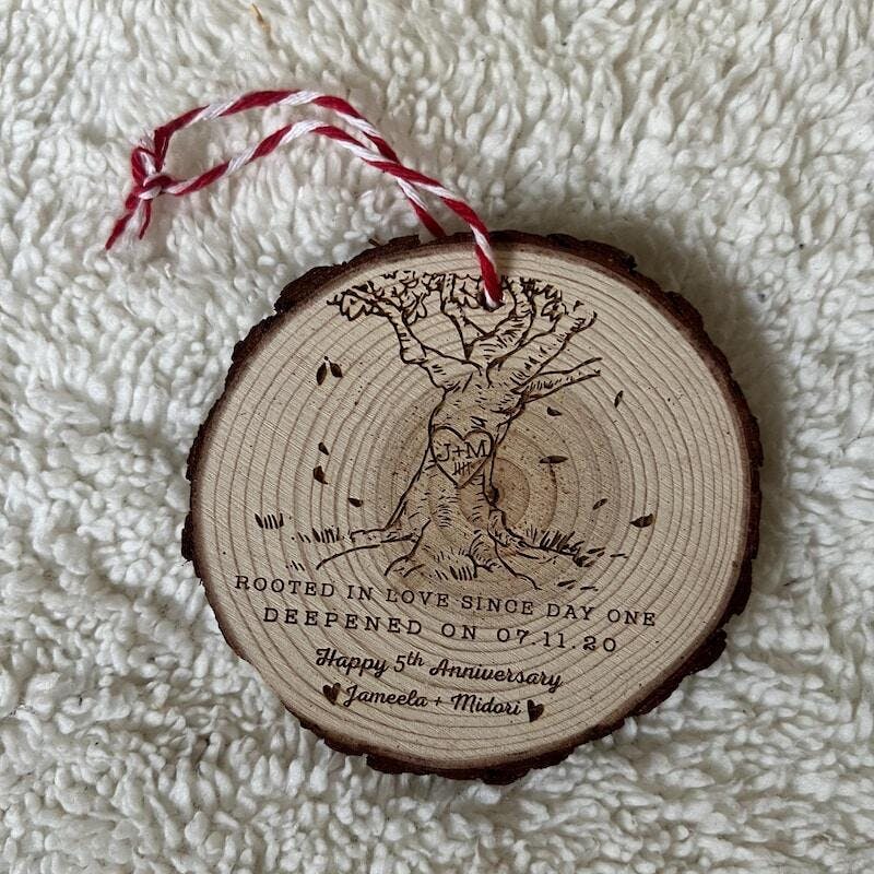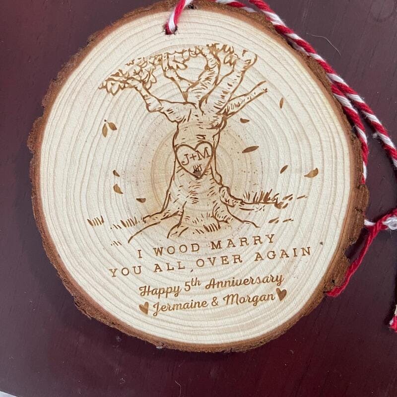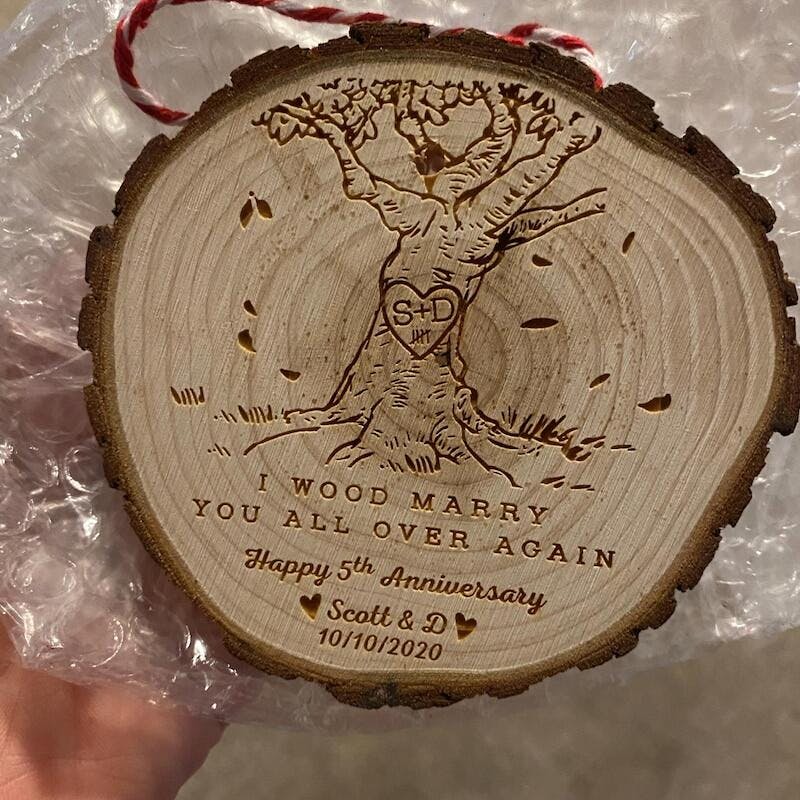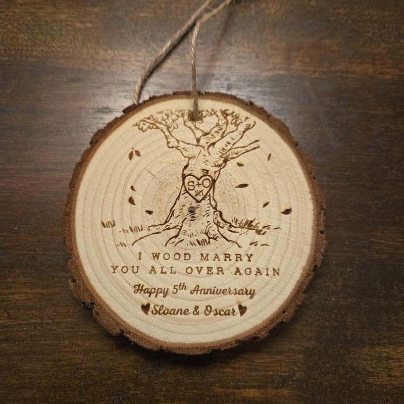 This custom wooden slice ornament celebrates a 5th wedding anniversary or Christmas for couples. The durable wood material symbolizes a strong marriage that will last for years to come. With the heartfelt message "I Wood Marry You All Over Again", this ornament makes a meaningful and romantic gift.