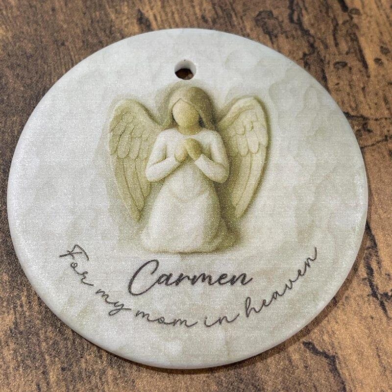 Honor the memory of a beloved son with this beautifully crafted personalized ceramic memorial ornament. A thoughtful bereavement keepsake, this ornament features a tender depiction of Jesus holding a child, symbolizing eternal love and comfort. Customize it with a name and a heartfelt message like 'Our Angel in Heaven' to create a truly unique and cherished tribute.