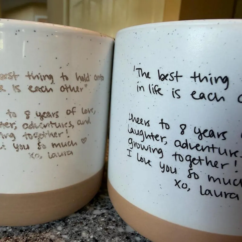 This listing is for an engraved mug, but I do want to highlight to future buyers that the mugs I received are different - one seems printed and the other seems engraved (the ink is starting to come off). That aside, the mugs make lovely gifts and the handwriting is very clear on the printed one. If you're looking for a custom handwriting mug and don't mind it might look a little different than the listing photos - I would definitely recommend!